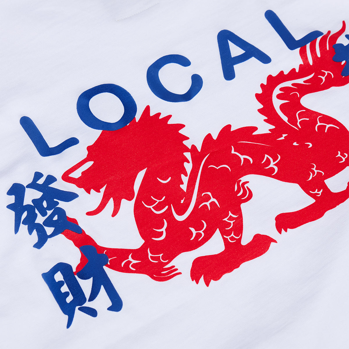- Red Dragon and LOCAL 恭喜發財 (gōng xǐ fā cái, "May you have a prosperous New Year!") - blue Chinese (traditional characters) puff print on the back