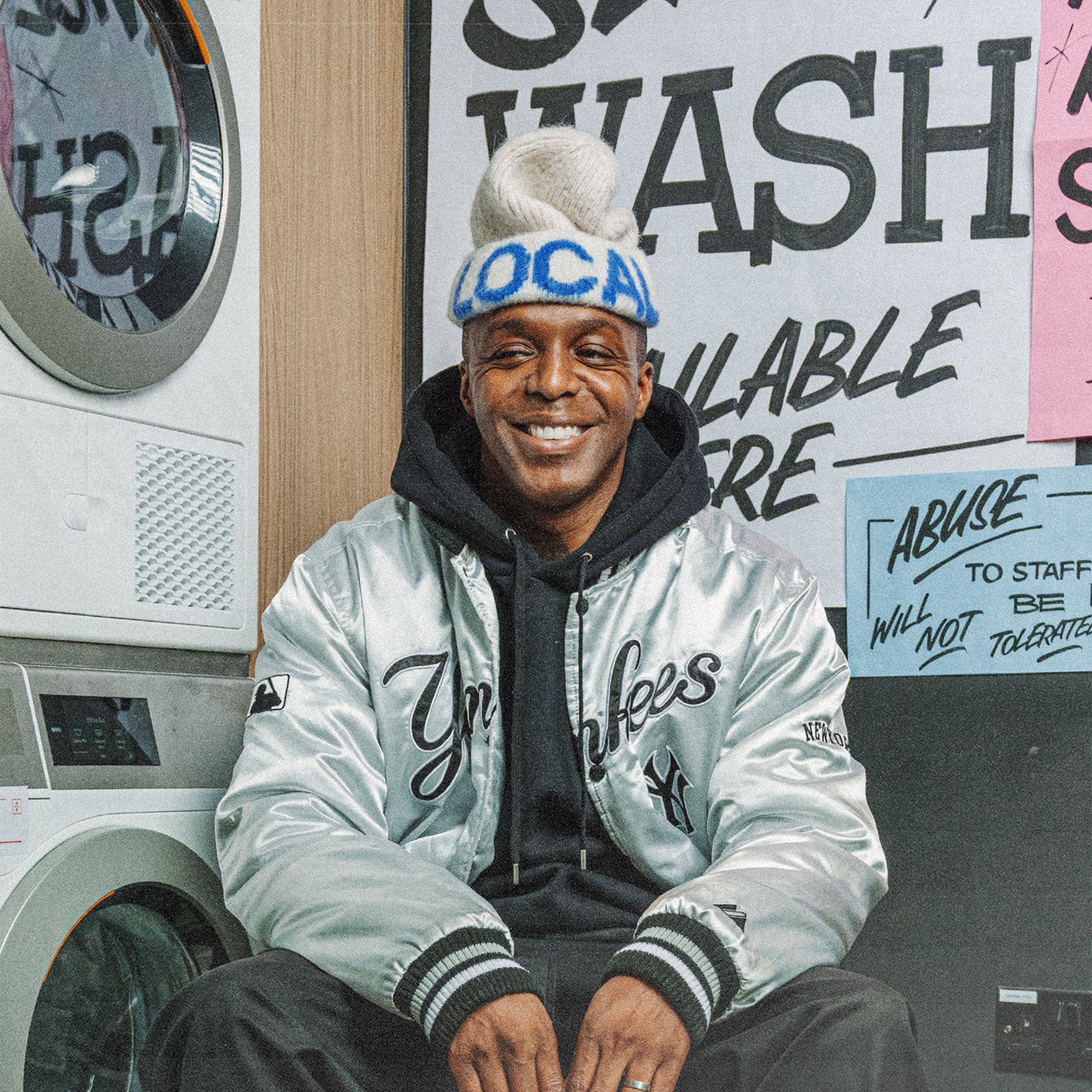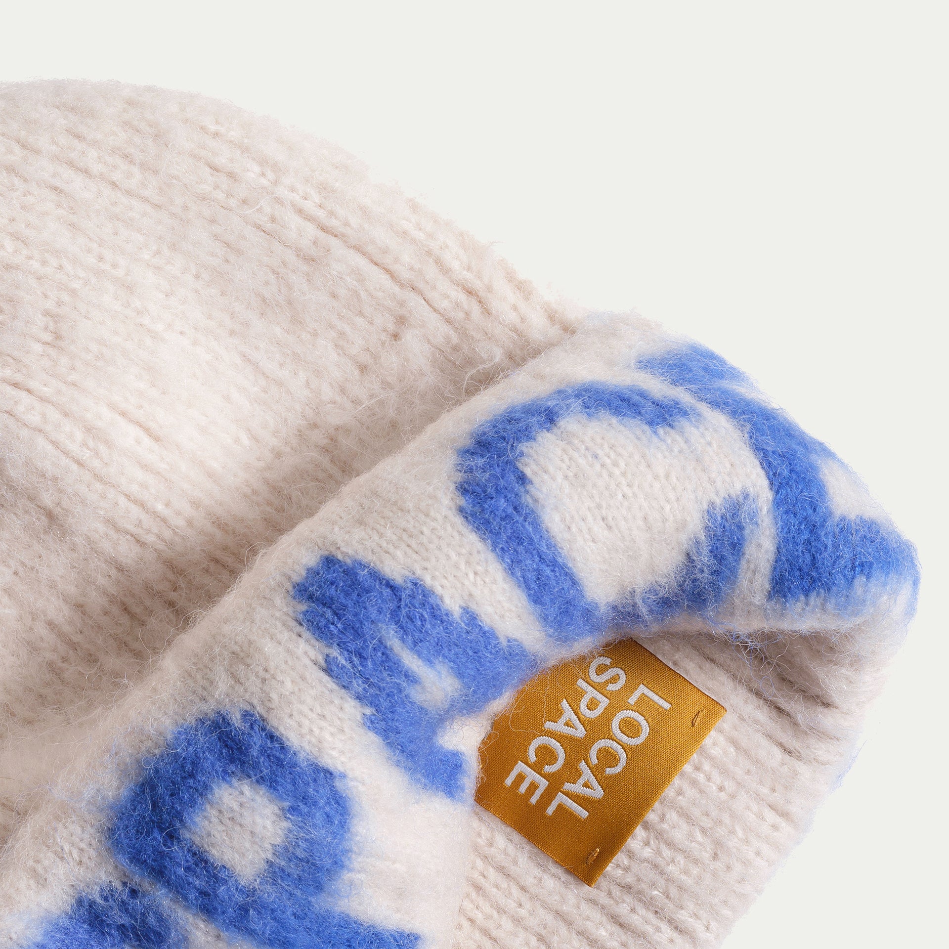 LOCAL and SPACE in bold, knitted-in blue text on the cuff all around